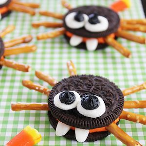 Stick the pretzel sticks into the icing of the Oreo. Put the icing on one side of the marshmallows and stick onto the top of the Oreo for the eyes. Dab a dot of black icing on top of the marshmallow. Cut theĀ white section of the candy corn off and stick in between the Oreo for the fangs.