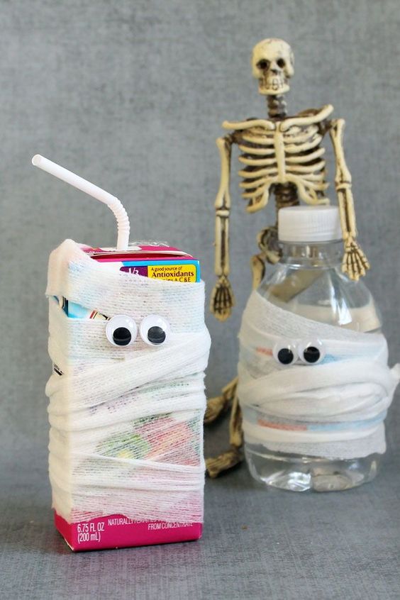 This is a quick and easy one! Wrap the juice box or water bottle with gauze. Glue the googly eyes on the gauze.