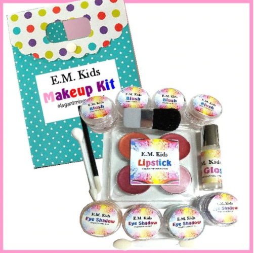 According to their website, the Pretty Play Makeup box set from No Nasties makeup is all-natural and cruelty-free. This kit contains 3 eye shadows, blush lip balm and applicators. No Nasties also sells a variety of cosmetics made just for kids starting princess at $5.